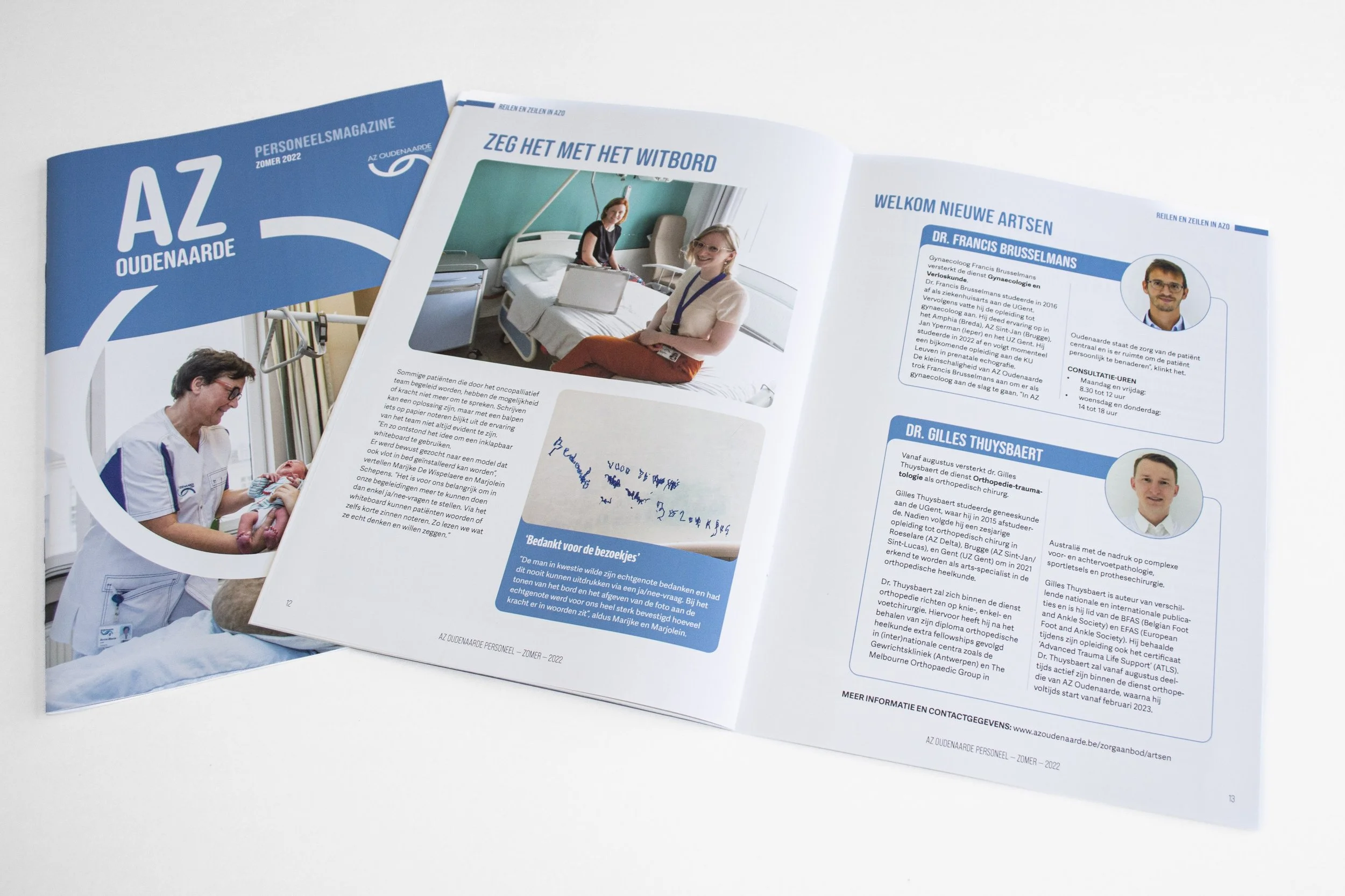 AZ Oudenaarde houdt haar medewerkers op de hoogte van het reilen en zeilen in het ziekenhuis met een tijdschrift. We gaven het personeelsblad een eigentijdse upgrade tot een volwaardig magazine met verhalen van collega’s, informatie uit het ziekenhuis en de bredere medische sector.